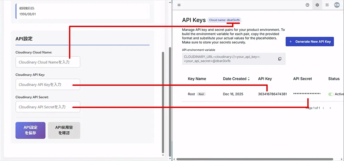 ログイン後、画像背景透過機能などを利用するためにCloudinaryのライセンス情報(APIキー)を設定します。